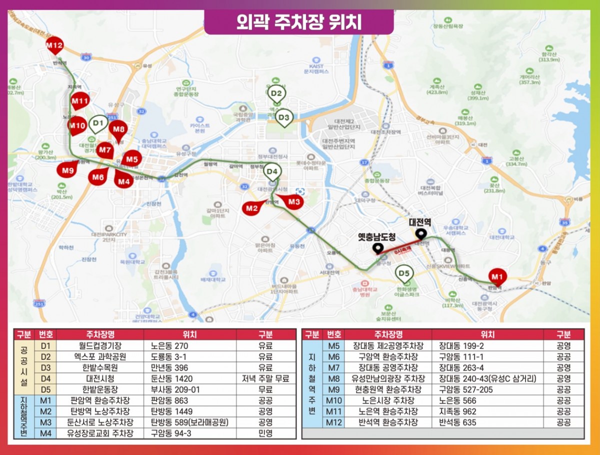 대전 0시 축제 주차장 거리가 생각보다 멀 수 있습니다. 멀리서 오신경우 지하철역 환승 주차장을 이용바랍니다. 구암역, 현충원역, 노은역, 반석역, 판암역 환승주차장을 이용하는 게 좋을 수 있습니다. 보다 자세한 주차 안내는 버튼을 눌러 확인 바랍니다.